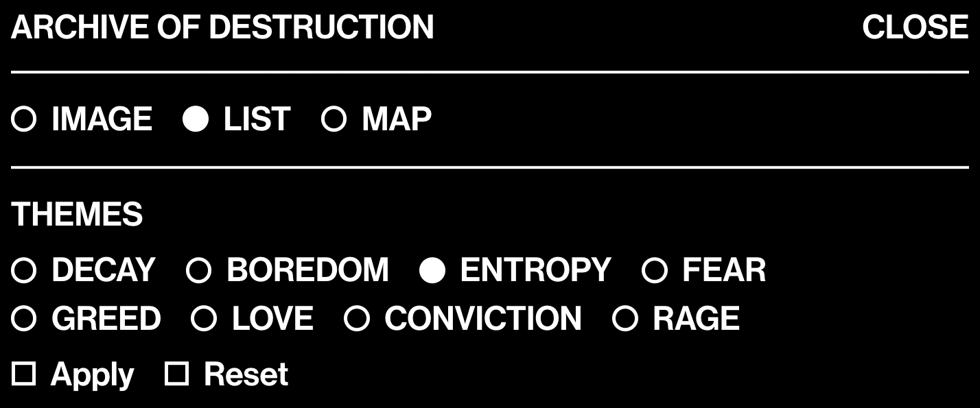 Curator Jes Fernie describes her Archive of Destruction as "a story-telling platform that brings together narratives around destruction and public art...made up of suspect categories, barely believable tales, and life-affirming strangeness. Spanning a hundred years and many continents, it tells cumulative stories of vulnerability, interference, rage, fear, boredom and love."