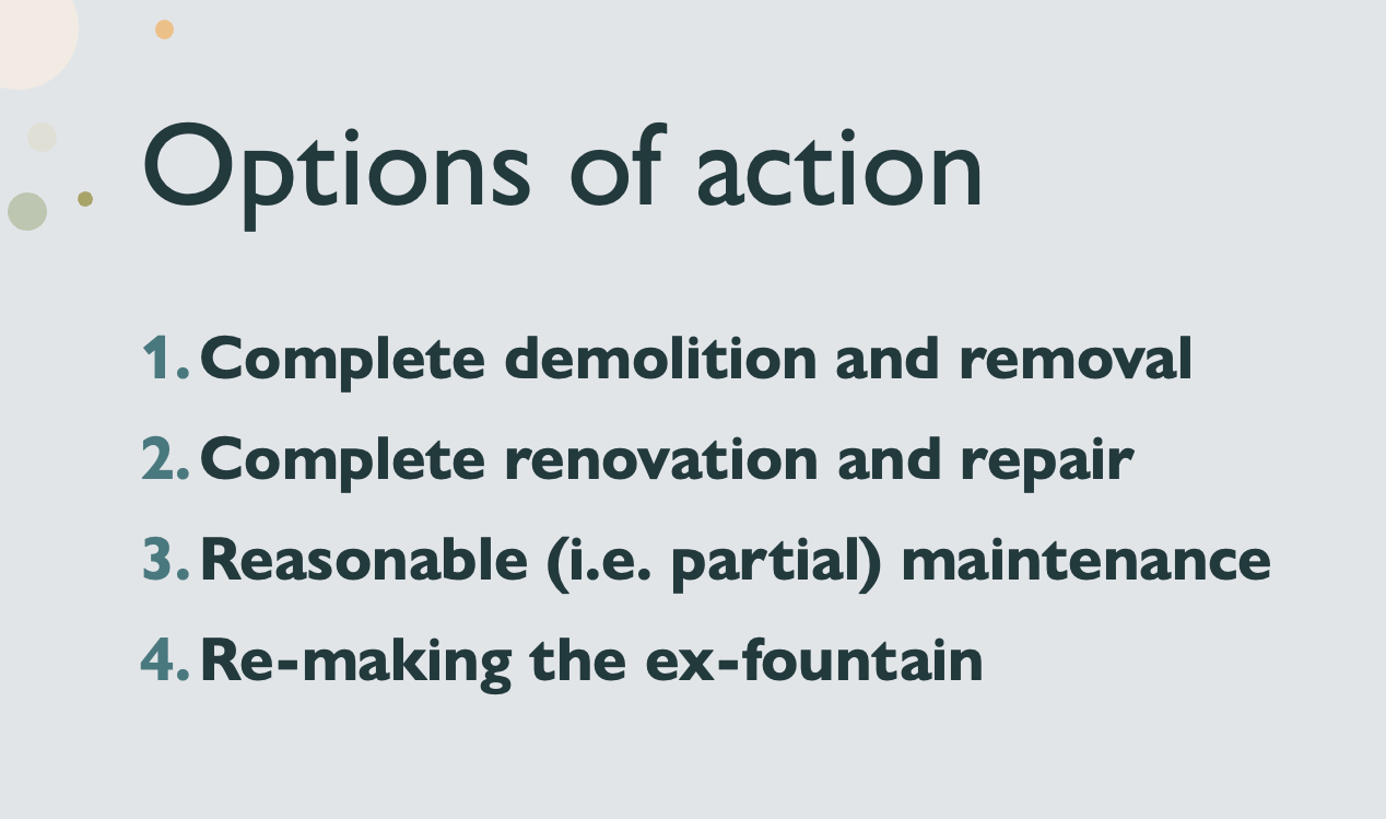 For Dan Karlholm, the LTH Fountain is no more – it has lost its fons (source) and relevance as a decorative element of the pre-politicized early 1960s, using tap water and electrical pumps to entertain tech students and tourists. Yet, he suggests, while always unsustainable as such, what remains of it today could provide a basis for a new life in relation to a different world, involving a new relationship to the elements. *Dan was introduced by Maddie Leach.